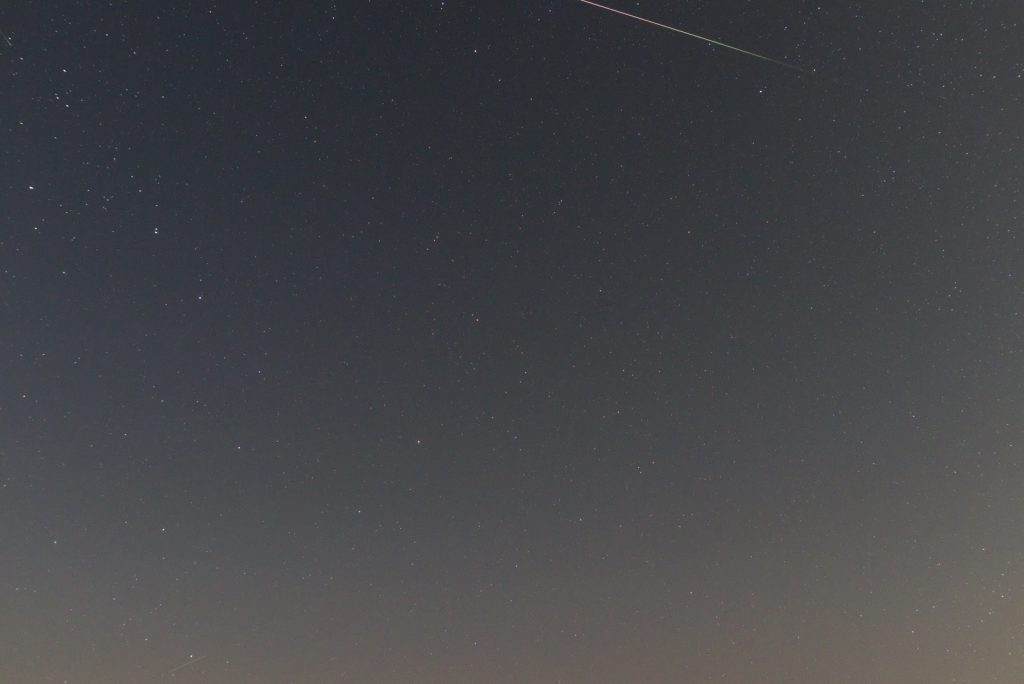 Še noč po maksimumu. Manj meteorjev kot prejšnjo noč, vseeno pa nekaj lepih. Najlepšega sem ujel malo več kot pol (letel je malo nad Malim vozom), v drugem delu je še enkrat zasvetil.
